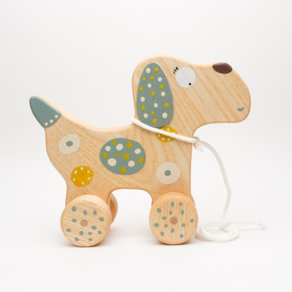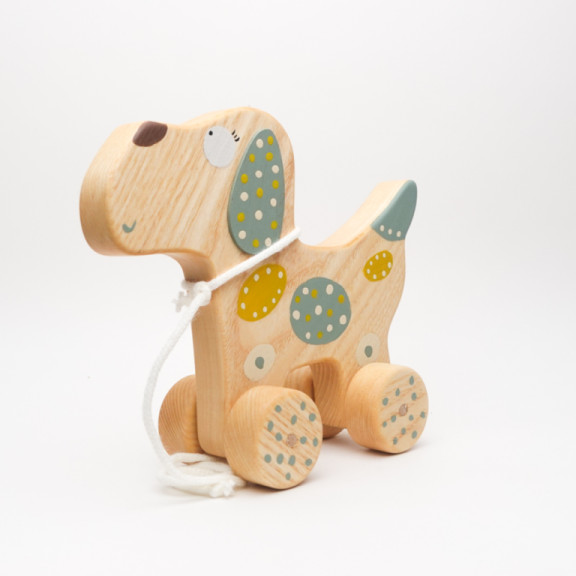 Hund aus Asche. Dank der Kordel um den Hals kann das Kind es ziehen. Geeignet für Kinder ab 18 Monaten.
