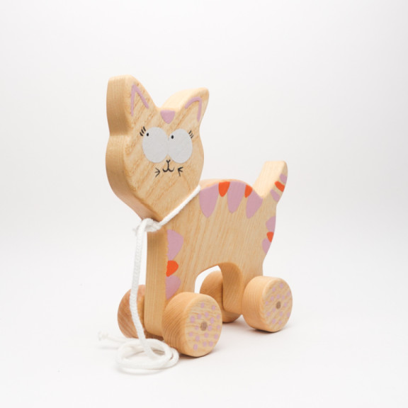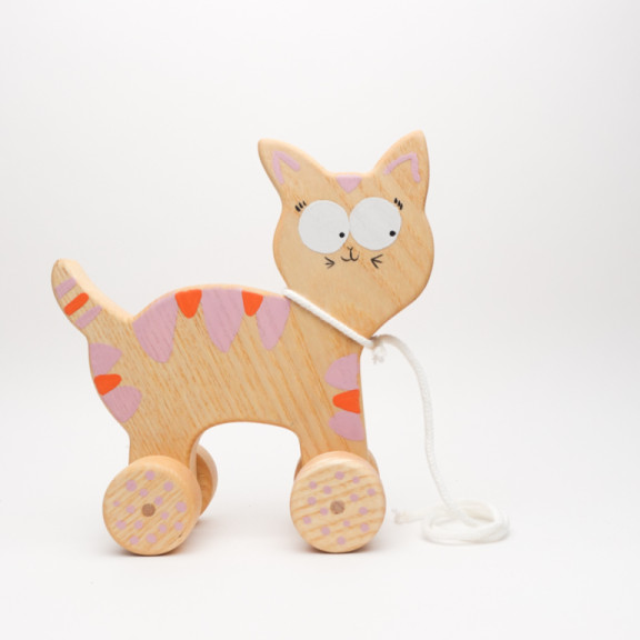Kätzchen aus Asche. Dank der Kordel um den Hals kann das Kind es ziehen. Geeignet für Kinder ab 6 Monaten.