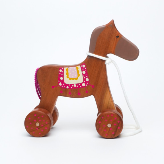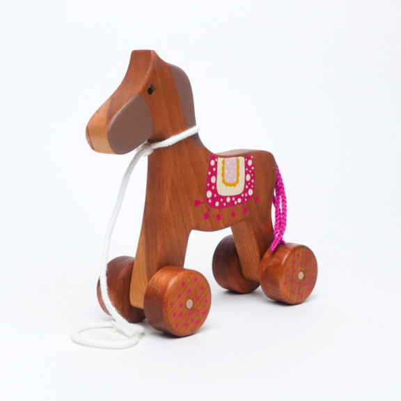 Pferd aus Kirschholz. Dank des Halsbandes kann das Kind es ziehen. Geeignet für Kinder ab 18 Monaten.