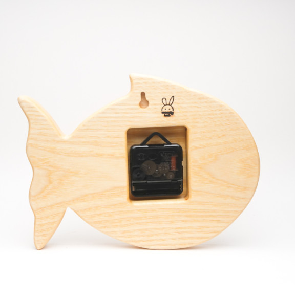 Fish-shaped clock in ash wood, with recessed mechanism and practical holes for hanging on the wall.