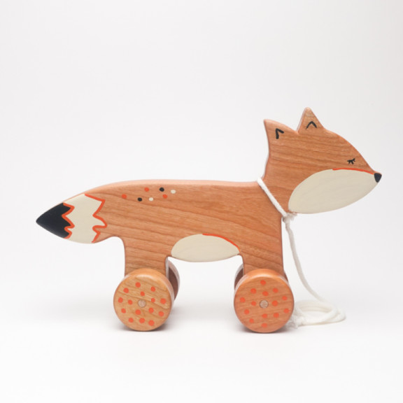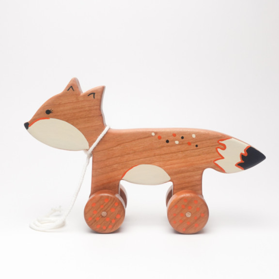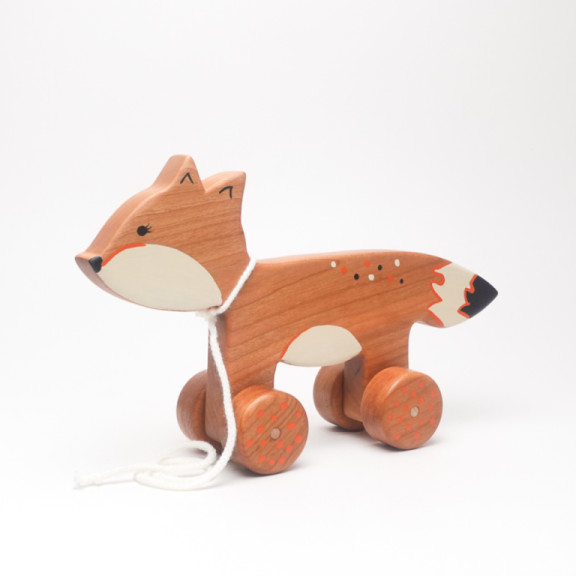 Fox in cherry wood. Thanks to the lanyard around the neck the child can tow it. Suitable for children aged 18 months and up.