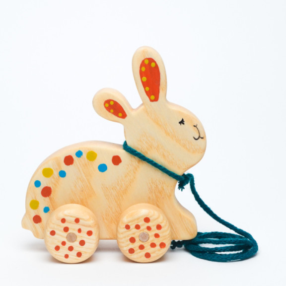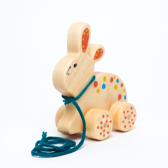 Rabbit in ash wood. Thanks to the lanyard around the neck the child can tow it. Suitable for children aged 6 months and up.