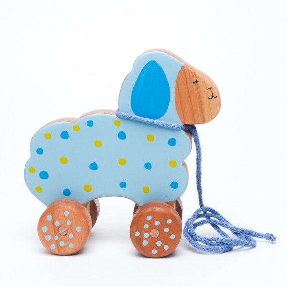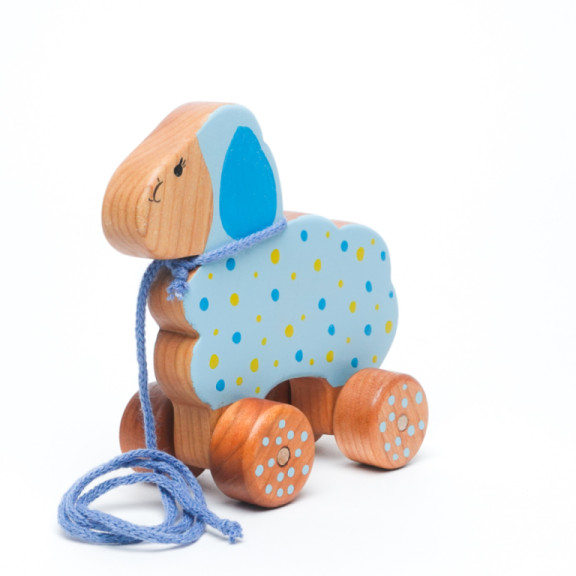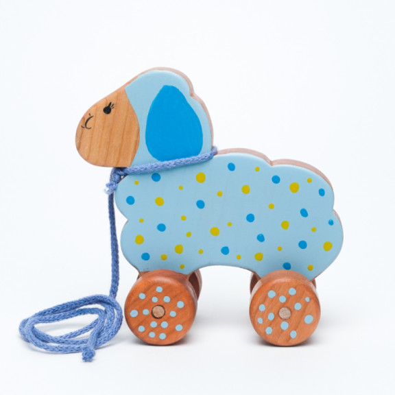 Towable sheep made of cherry wood. Thanks to the lanyard around the neck the child can tow it. Suitable for children aged 6 months and up.