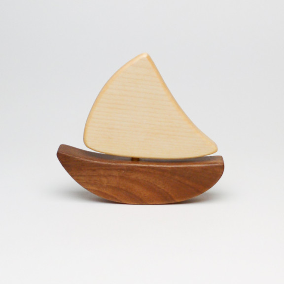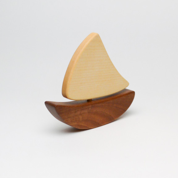 Small sailboat with hull in fine Neapolitan walnut and sail in maple wood. Suitable for children aged 18 months and up.