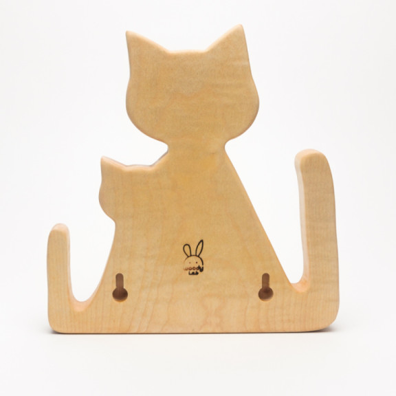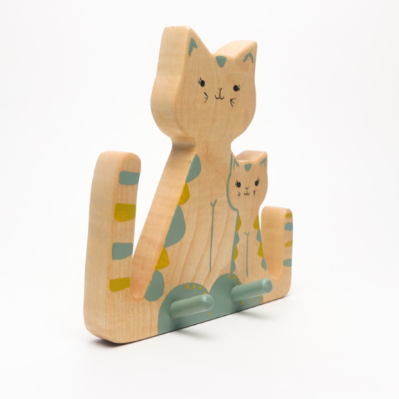 Appendiabiti a forma di gatti in legno di acero, con due pratici chiodini in legno per appendere gli oggetti e pratici fori per essere appeso alla parete.