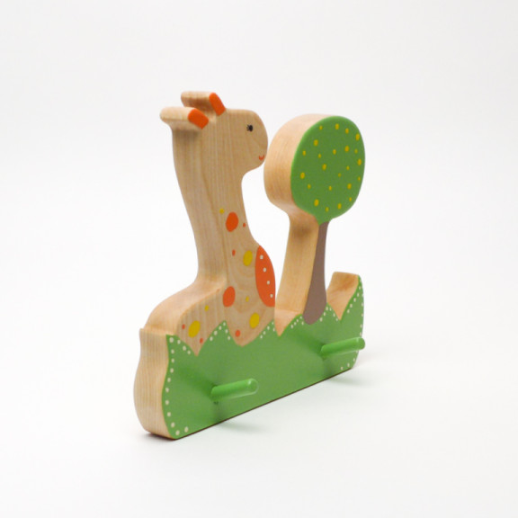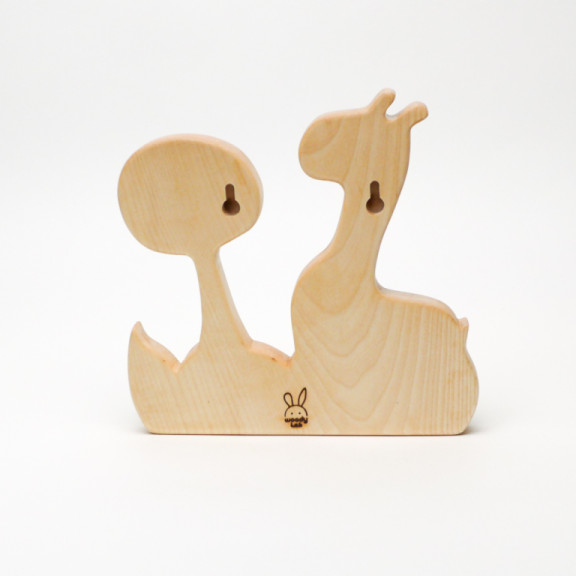 Appendiabiti a forma di giraffa in legno di acero, con due pratici chiodini in legno per appendere gli oggetti e pratici fori per essere appeso alla parete.