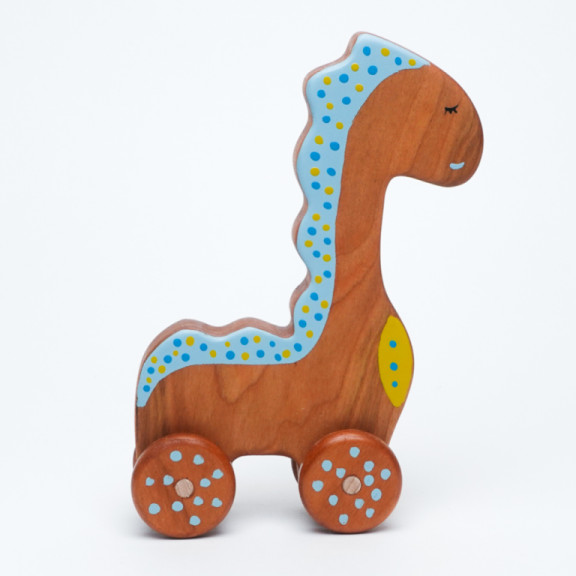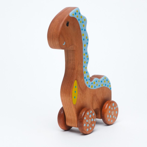 Un tenero dinosauro in legno di ciliegio, pensato per accompagnare i primi giochi e le grandi scoperte dei più piccoli.