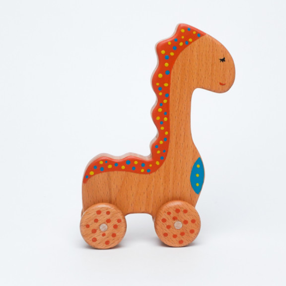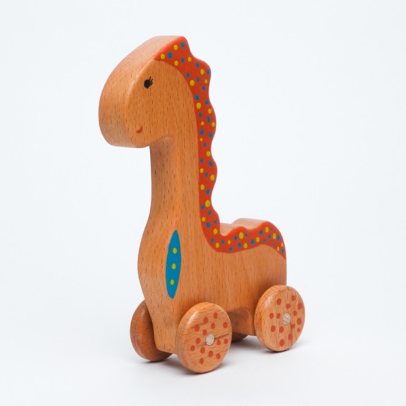 Un tenero dinosauro in legno di faggio, pensato per accompagnare i primi giochi e le grandi scoperte dei più piccoli.