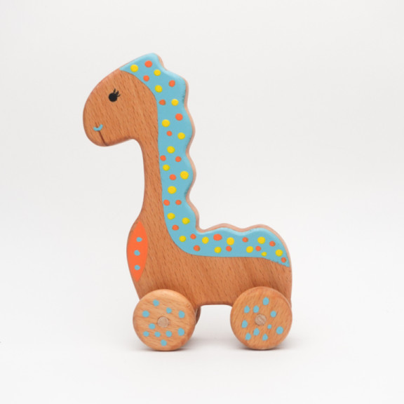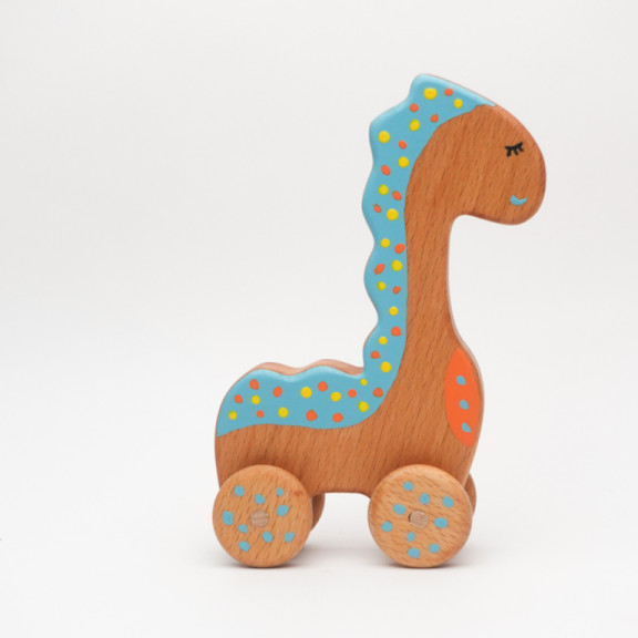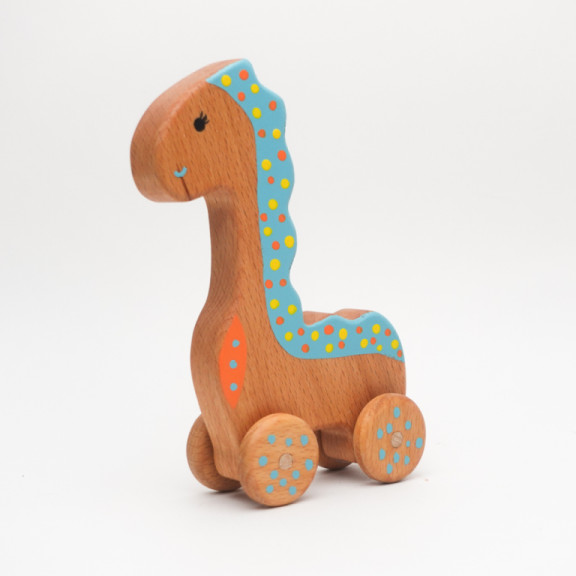 Un tenero dinosauro in legno di faggio, pensato per accompagnare i primi giochi e le grandi scoperte dei più piccoli.
