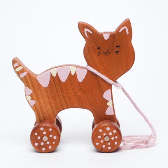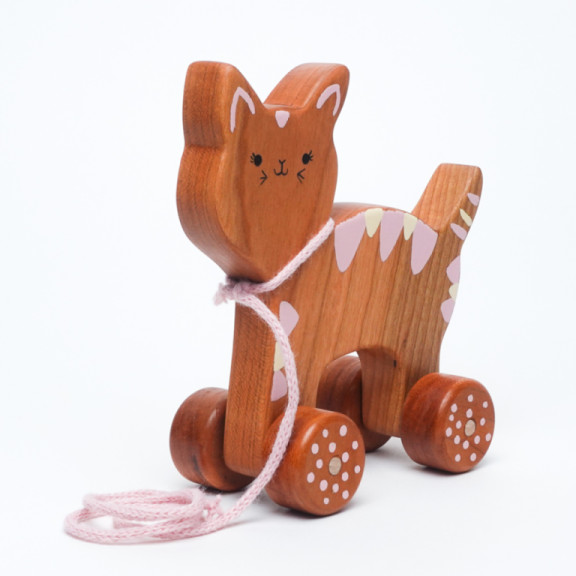 Realizzato in legno di ciliegio levigato e rifinito con colori atossici e olio di lino crudo, questo gattino trainabile stimola la curiosità e la motricità del bambino.