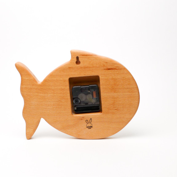 Orologio a forma di pesce in legno di faggio, con meccanismo a incasso e pratici fori per essere appeso alla parete.