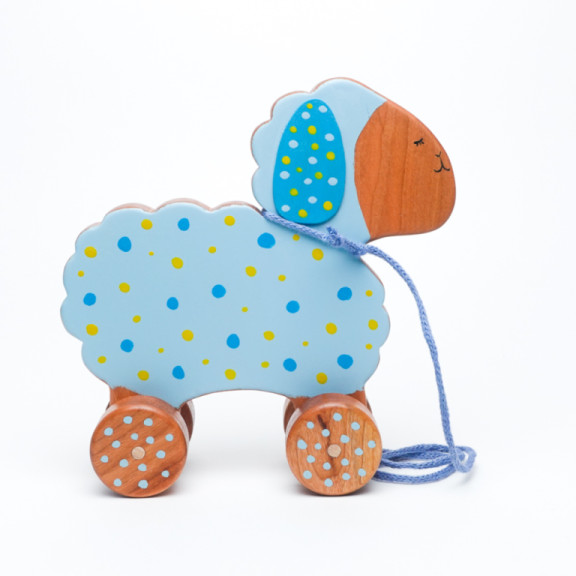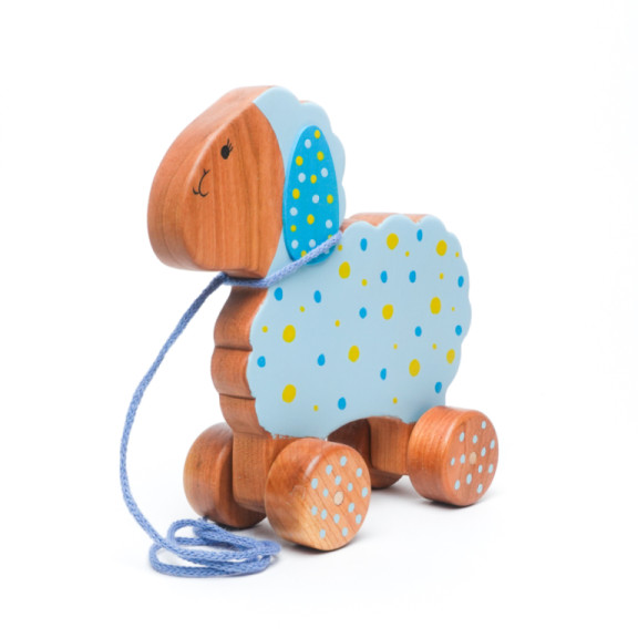 Una tenera Pecorella in legno di ciliegio, pronta ad accompagnare il tuo bambino nelle sue prime avventure.