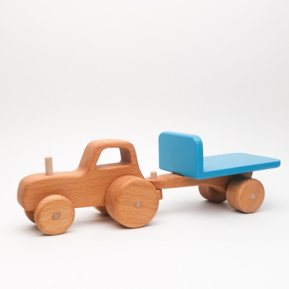 Realizzato interamente in legno di faggio, è solido, naturale e piacevole da toccare. Il rimorchio rimovibile può trasportare piccoli oggetti o altri personaggi, stimolando la fantasia e il gioco libero.